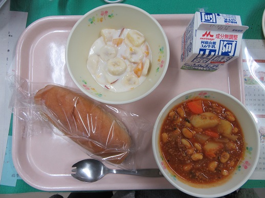 玄米パン 牛乳 大豆とひき肉のトマト煮 フルーツヨーグルト