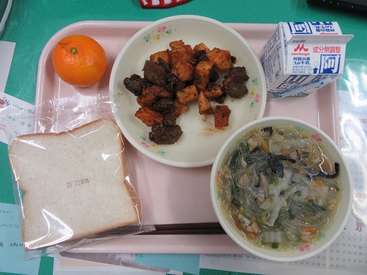 食パン 牛乳 にら入り春雨スープ レバーのマリアナソース みかん