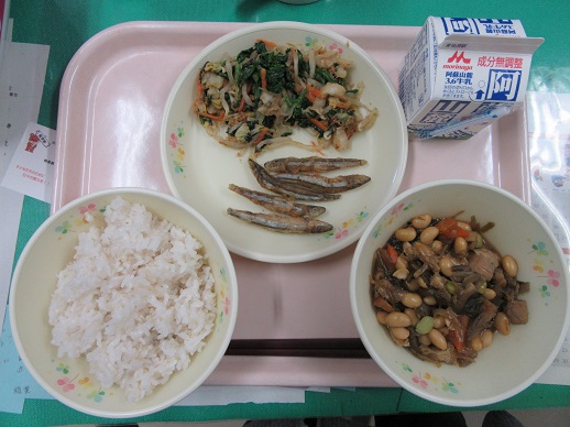 麦ごはん 牛乳 大豆の磯煮 きびなごフライ ほうれんそうのお浸し