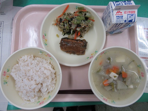 麦ごはん 牛乳 のっぺ汁 さばのみそ煮 白菜のごま和え