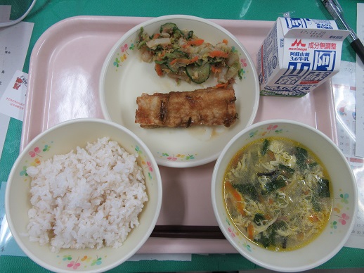 麦ごはん 牛乳 にらたま汁 太刀魚のねぎソース 野菜のおかか和え