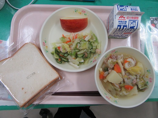 玄米パン 牛乳 ポトフ ツナサラダ りんご