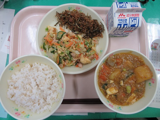 今日は、ふるさとくまさんデーで、熊本でよく食べられている馬肉を使った混ぜご飯をしました。