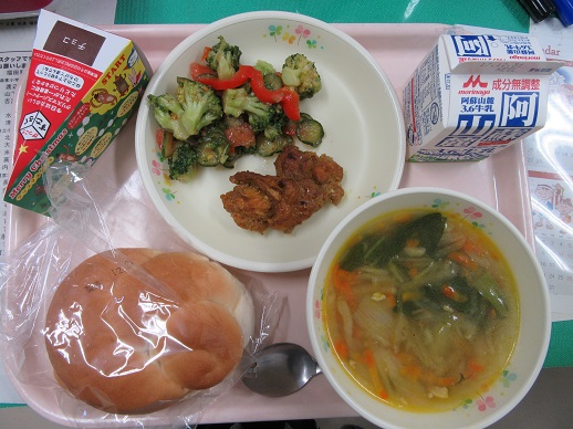 火の国パン 牛乳 タンドリーチキン 野菜スープ 赤と緑のサラダ セレクトケーキ