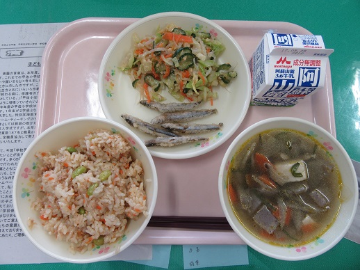 そぼろごはん 牛乳 けんちん汁 野菜のアーモンド和え きびなごのからあげ