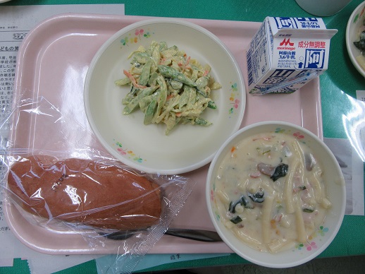 玄米パン 牛乳 マカロニのクリーム煮 アスパラガスのサラダ