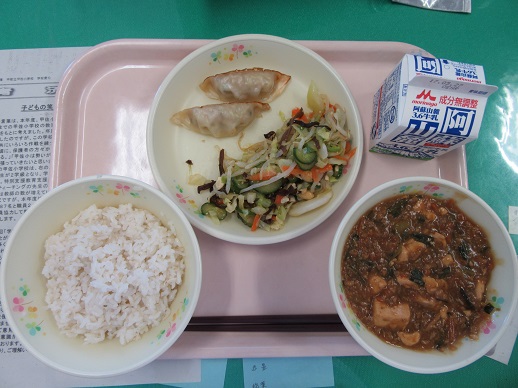 麦ごはん 牛乳 麻婆豆腐 中華サラダ ぎょうざ