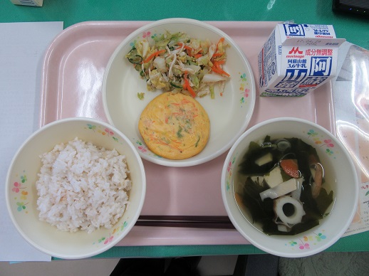 麦ご飯 牛乳 若竹汁 かみかみするめ和え シラスの卵寄せ