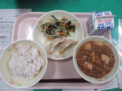 麦ごはん 牛乳 麻婆豆腐 餃子 野菜のナムル
