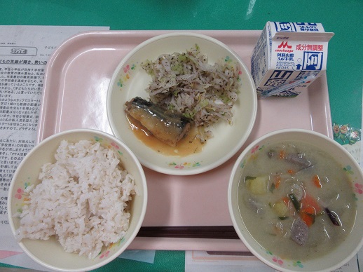 麦ごはん 牛乳 さんまのゆずみそ煮 さつま汁 野菜のゆかり和え