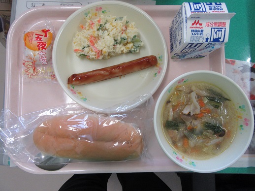 ホットドッグ(割コッペパン ウィンナーケチャップソース ポテトサラダ) 野菜スープ