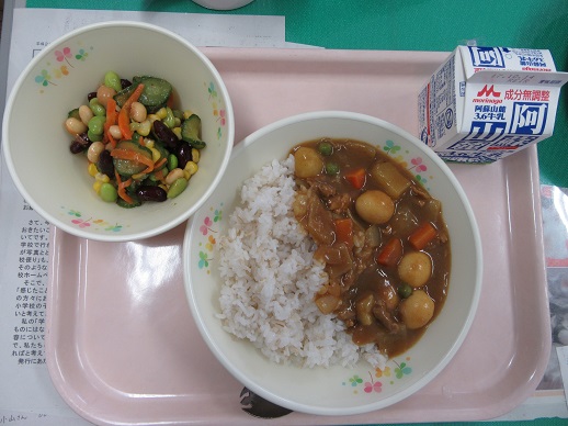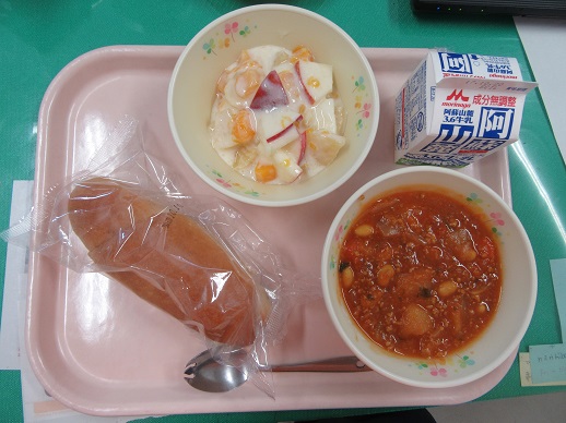 玄米パン 牛乳 大豆とひき肉のトマト煮 フルーツヨーグルト