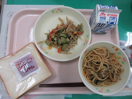 食パン 牛乳 焼きそば ごぼうサラダ イチゴジャム