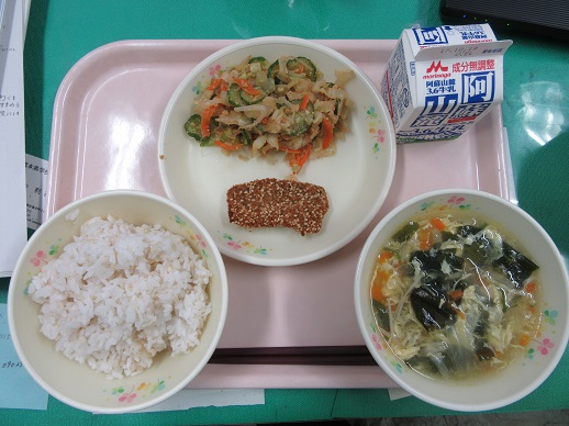 麦ごはん 牛乳 さんまのゴマ衣揚げ かき卵汁 野菜のピーナッツ和え
