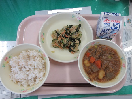 麦ごはん 牛乳 じゃがいものそぼろあんかけ わかめとツナのゴマサラダ