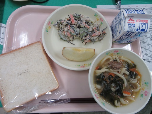 食パン 牛乳 肉わかめうどん ひじきサラダ りんご