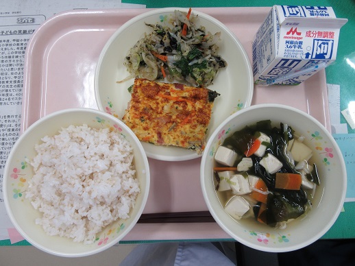 麦ごはん 牛乳 豆腐のすまし汁 手作り厚焼き玉子 野菜の磯和え