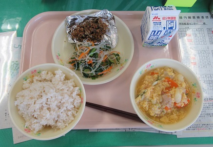 麦ごはん 牛乳 麻婆豆腐 中華サラダ ぎょうざ