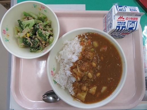 ビーンズカレーライス 牛乳 ツナとブロッコリーのサラダ