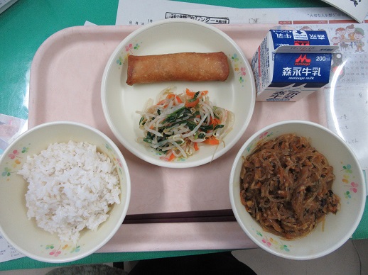 麦ごはん 牛乳 麻婆春雨 にらのナムル 春巻き