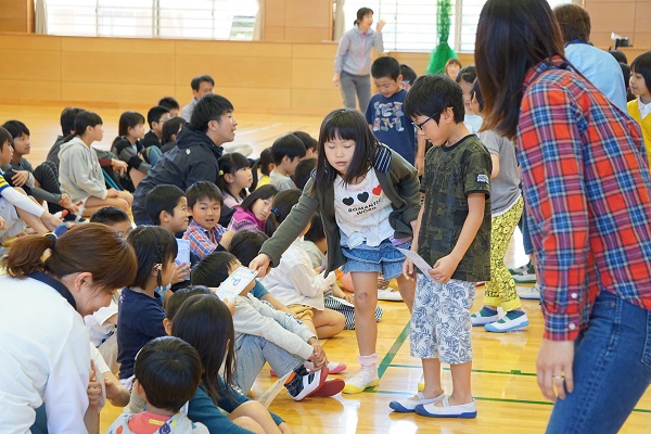 係の方と一緒に2名のおじいちゃん、おばあちゃんにおいでいただき、子どもたちは直接手渡しで贈り物をいただきました。子どもたちはとてもうれしそうで、握手をしてもらったりしていました。