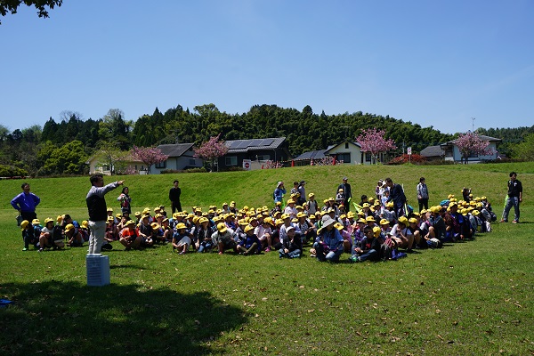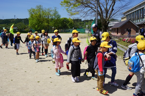 1年生を迎える会の終了後、いよいよ遠足に出発です。目的地は、有安のグリーンパル甲佐です。5・6年生が1年生の手を引いて安全に気をつけながら歩きました。
