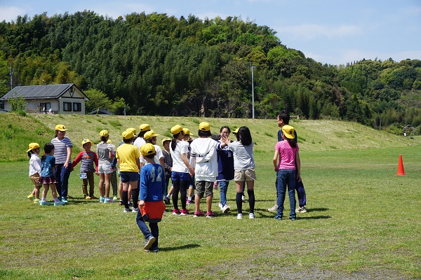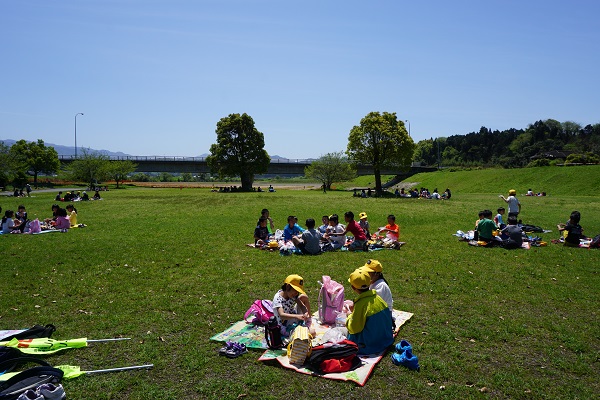 お弁当の後は、自由時間です。土手を滑ったり、鬼ごっこをしたり、みんなそれぞれの遊びを楽しんでいました。いろんな学年が集まって、はないちもんめをしていた子どもたちもいました。