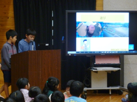 今日の業間は,かがやき集会でした。4年生の国語「アップとルーズ」の学習の発表です。
