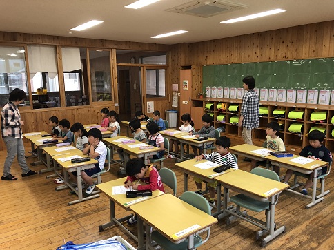 左は5年生、電子黒板を使って瀧本先生と理科の授業を頑張っていました。右は6年生、こちらも電子黒板を使って、吉冨先生と清田先生から算数の指導を受け、頑張っていました。