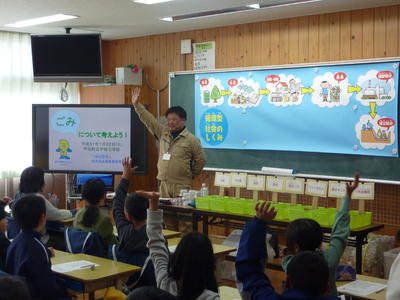 今日(1/22)、4年生で環境に関する出前授業を行っていただくことができました。来ていただいたのは、一般財団法人 熊本県産業資源循環協会宇城支部の方々6名でした。