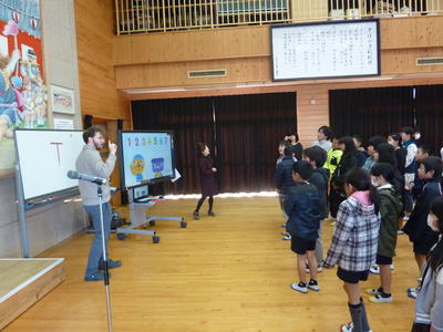 今日(1/24)の業間にイングリッシュタイムが行われました。毎週木曜日に来校してくださるALTのサングスター先生に協力してもらって行っています。