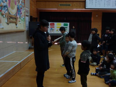 その後は、ゲームを楽しみました。数字の歌を歌った後に、サングスター先生が言われる人数で集まって座るというゲームです。簡単なゲームでしたが、英語で行うことで楽しさも増し、英語に親しむこともできました。