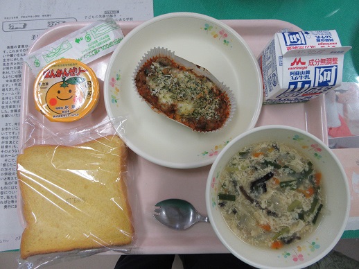 かぼちゃパン なすのミートソースグラタン にらたま汁 ばんかんゼリー
