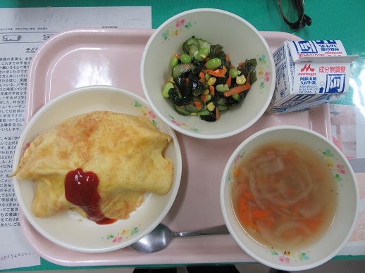 オムライス(チキンライス オムレツシート トマトケチャップ) ポテトのスープ 枝豆サラダ