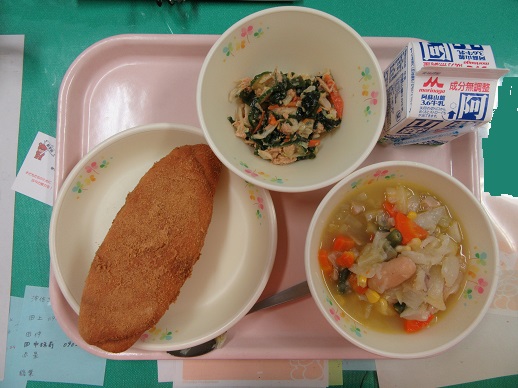 揚げパン 牛乳 ポトフ わかめとツナのゴマサラダ