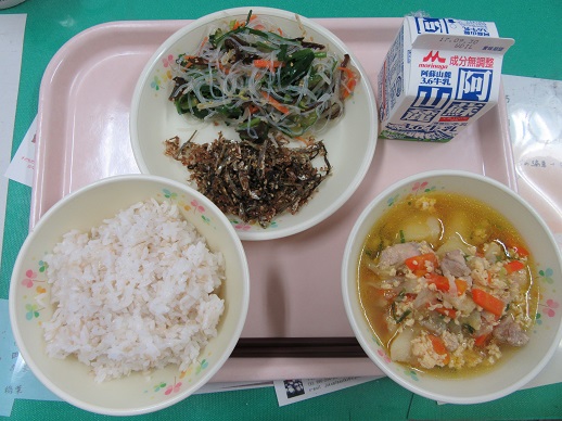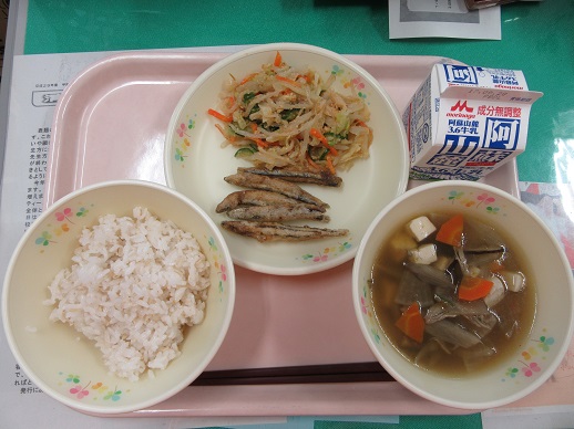 麦ごはん 牛乳 けんちん汁 野菜のピーナッツ和え きびなごからあげ