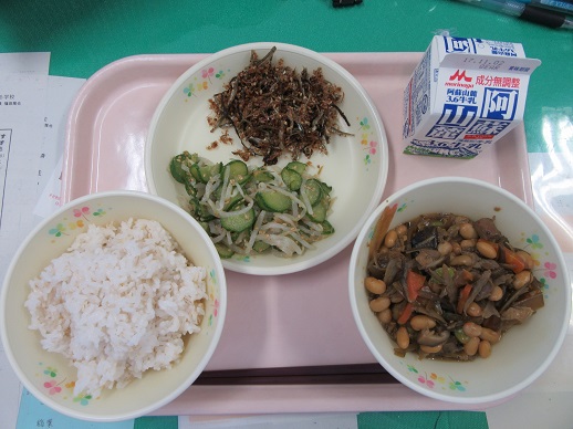 麦ごはん 牛乳 大豆の磯煮 きゅうりのごま和え 手作り佃煮