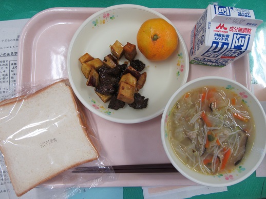 食パン 牛乳 汁ビーフン おさつレバー みかん