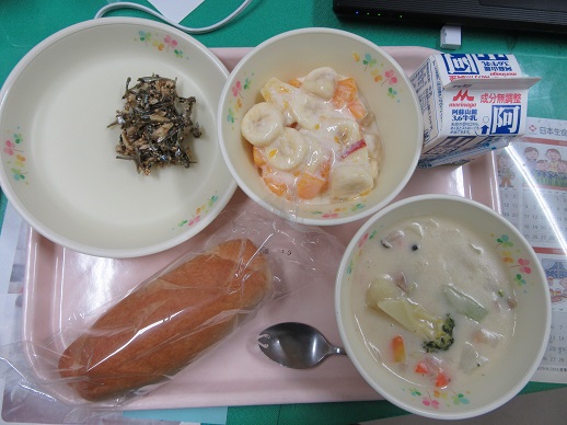 コッペパン 牛乳 冬野菜のクリームシチュー ツナとブロッコリーのサラダ