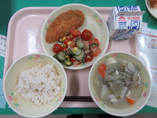 麦ごはん 牛乳 豚汁 ミニトマトのサラダ 鮭磯の香チーズフライ
