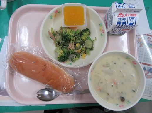コッペパン 牛乳 冬野菜のクリームシチュー ツナとブロッコリーのサラダ