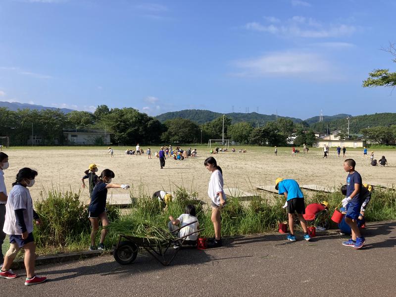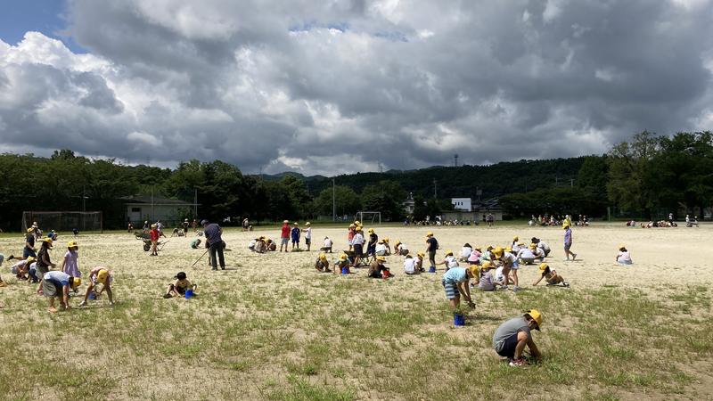 業間タイムで、グラウンドの草取りをしました。夏は草もぐんぐん伸びます!