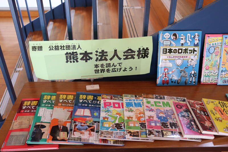 (2枚目)熊本法人会から5万円分の図書が寄贈されました。司書の中島先生に飾ってもらいました。様々な機関や団体にお世話になっている甲佐小学校です。