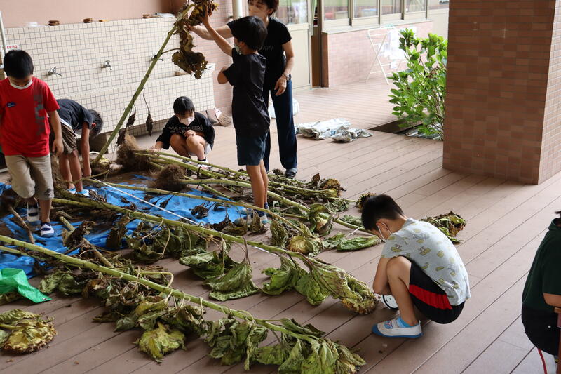 上の写真:学校だより「清流」で紹介した大きなひまわりを3年生が収穫して、測ってました。