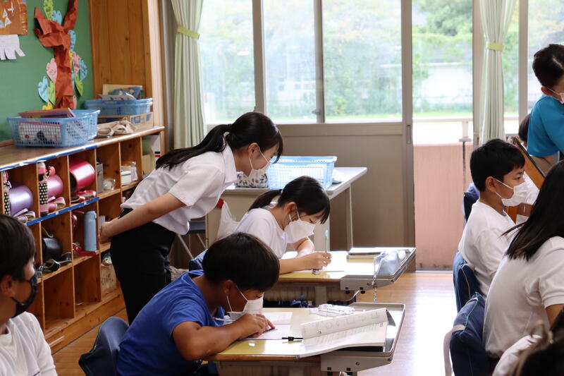 下の写真:今日から甲佐小出身の大学生が観察実習生として6年1組に来ています。6年1組は大喜びです。