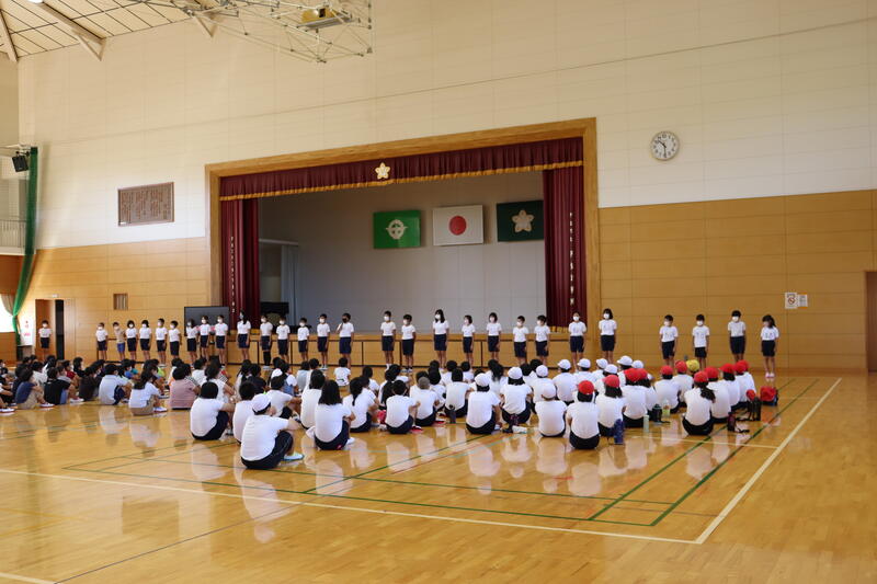 今日の業間活動はわかあゆ集会で環境委員会と児童会執行部からの発表でした。