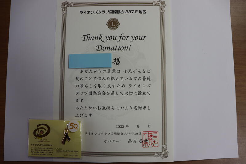 (4枚目)小児がんの子供に髪の毛を寄付するヘアドネーションの感謝状がライオンズクラブから届きました。