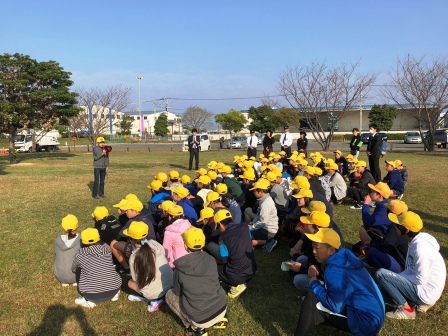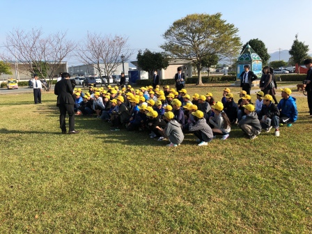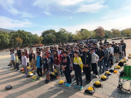 家庭科室から出火したという想定で、火災発生の放送を確実に聞いた後、運動場に避難しました。