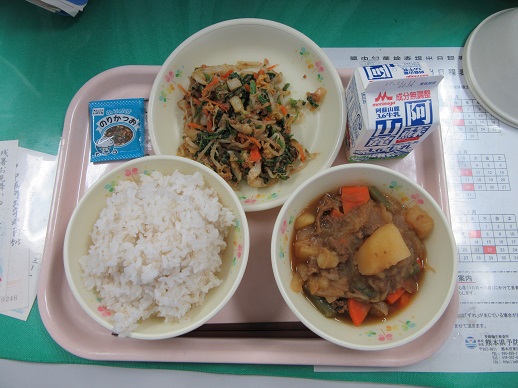 麦ごはん 牛乳 牛肉とじゃがいもの煮込み ほうれんそうのお浸し ふりかけ