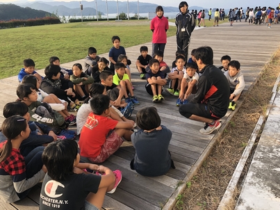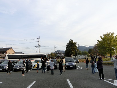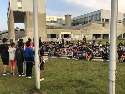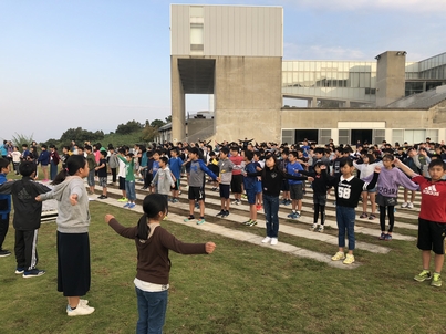 他の団体と一緒に『朝の集い』に参加して、団体紹介・ラジオ体操をしました。
